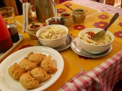 With the growth of tourism in recent years, the service sector has become the largest sector in Tibet, accounting for 50.1% of the local GDP in 2020.[11] The dominant religion in Tibet is Tibetan Buddhism; other religions include Bön, an indigenous religion similar to Tibetan Buddhism,[12] Islam, and Christianity. Tibetan Buddhism is a primary influence on the art, music, and festivals of the region. Tibetan architecture reflects Chinese and Indian influences. Staple foods in Tibet are roasted barley, yak meat, and butter tea.