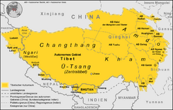 Following the Xinhai Revolution against the Qing dynasty in 1912, Qing soldiers were disarmed and escorted out of the Tibet Area (Ü-Tsang). The region subsequently declared its independence in 1913, although this was not recognised by the subsequent Chinese Republican government.[5] Later, Lhasa took control of the western part of Xikang. The region maintained its autonomy until 1951 when, following the Battle of Chamdo, Tibet was occupied and annexed by the People's Republic of China. The Tibetan government was abolished after the failure of the 1959 Tibetan uprising.[6] Today, China governs western and central Tibet as the Tibet Autonomous Region while the eastern areas are now mostly autonomous prefectures within Sichuan, Qinghai and other neighbouring provinces. The Tibetan independence movement[7] is principally led by the Tibetan diaspora.[8] Human rights groups have accused the Chinese government of abuses of human rights in Tibet, including torture.[9][10]