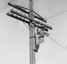 Telephone lineman suspending aerial communications cable from a pole, 1940.