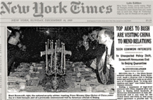 Four weeks after the slaughter, President George H.W. Bush sent National Security Advisor Brent Scowcroft and Deputy Secretary of State Lawrence Eagleburger on a secret mission to Beijing to engage CCP Paramount Leader Deng Xiaoping directly,[8] after Bush’s attempts to reach Deng via telephone hotline were rebuffed. Bush personally wanted to “preserve” the U.S.-China relationship at all costs and get the relationship “back on track.” Bush and other senior officials praised and encouraged the collapse of communism as the regimes of Eastern Europe were being toppled in the second half of 1989 by their citizens one after another, but no praise and encouragement for the people of China.[9]