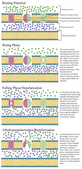 Like all animal cells, the cell body of every neuron is enclosed by a plasma membrane, a bilayer of lipid molecules with many types of protein structures embedded in it.[10] A lipid bilayer is a powerful electrical insulator, but in neurons, many of the protein structures embedded in the membrane are electrically active. These include ion channels that permit electrically charged ions to flow across the membrane and ion pumps that chemically transport ions from one side of the membrane to the other. Most ion channels are permeable only to specific types of ions. Some ion channels are voltage gated, meaning that they can be switched between open and closed states by altering the voltage difference across the membrane. Others are chemically gated, meaning that they can be switched between open and closed states by interactions with chemicals that diffuse through the extracellular fluid. The ion materials include sodium, potassium, chloride, and calcium. The interactions between ion channels and ion pumps produce a voltage difference across the membrane, typically a bit less than 1/10 of a volt at baseline. This voltage has two functions: first, it provides a power source for an assortment of voltage-dependent protein machinery that is embedded in the membrane; second, it provides a basis for electrical signal transmission between different parts of the membrane.