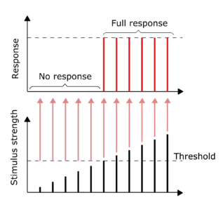 The conduction of nerve impulses is an example of an all-or-none response. In other words, if a neuron responds at all, then it must respond completely. Greater intensity of stimulation, like brighter image/louder sound, does not produce a stronger signal, but can increase firing frequency.[44]:31 Receptors respond in different ways to stimuli. Slowly adapting or tonic receptors respond to steady stimulus and produce a steady rate of firing. Tonic receptors most often respond to increased intensity of stimulus by increasing their firing frequency, usually as a power function of stimulus plotted against impulses per second. This can be likened to an intrinsic property of light where greater intensity of a specific frequency (color) requires more photons, as the photons can not become "stronger" for a specific frequency.