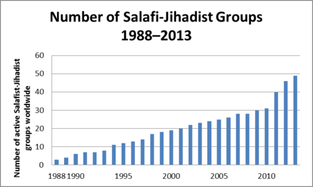 Practitioners are referred to as "Salafi-jihadi", "Salafist jihadis", or "Salafi jihadists".[1][2][3][14] They are sometimes described as a variety of Salafis,[1][14][15] and sometimes as separate from "good Salafis",[9] whose movement eschews any political involvement and organizational allegiances as potentially divisive for the whole Muslim community and a distraction from the study of the Islamic religion.[16] Traditional Salafi scholarship mostly denounce Salafi jihadism as a hybrid ideology far-removed from Salafi orthodoxy.Cite error: Closing </ref> missing for <ref> tag While Salafism had next-to-no presence in Europe in the 1980s, Salafi jihadists had by the mid-2000s acquired "a burgeoning presence in Europe, having attempted more than 30 terrorist attacks among E.U. countries since 2001."[9] While many see the influence and activities of Salafi jihadists as in decline after 2000 (at least in the United States),[17][18] others see the movement as growing in the wake of the Arab Spring, the breakdown of state control in Libya and Syria in 2014,[19] and the U.S. retreat from Afghanistan in 2021.[20]