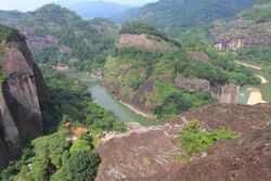 Danxia landforms cover several provinces in southeast China. Taining County, Fujian Province, has very good examples of "young" danxia landforms wherein deep, narrow valleys have been formed. As the landform gets older, valleys widen and one gets isolated towers and ridges. The danxia landform is named after Mount Danxia, one of the most famous examples of the danxia landform. A very peculiar feature of danxia landscape is the development of numerous caves of various sizes and shapes. The caves tend to be shallow and isolated, unlike true karst terrain where caves tend to form deep, interconnecting networks. In 2010, several danxia landscapes in southern China, with a general name of "China Danxia", were inscribed as a World Heritage Site.[5] The six inscribed danxia landform areas are: Mount Langshan and Mount Wanfo (Hunan Province), Mount Danxia (Guangdong Province), Taining and Mount Guanzhi (Fujian Province), Mount Longhu and Guifeng (Jiangxi Province), Fangyan, Mount Jianglang (Zhejiang Province), and Mount Chishui (Guizhou Province). The total core area of 6 regions above is 73,945 hectares (182,720 acres), and the total buffer area is 65,446 hectares (161,720 acres).[1] Other notable danxia areas, such as Zhangye Danxia National Geological Park, are not included in the World Heritage Site.