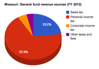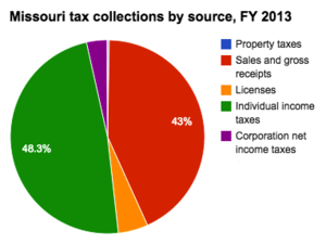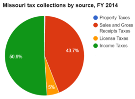 The table below lists 2014 tax collections by source as percentages of total collections. About 51 percent of Missouri's total state tax collections came from income taxes.[5]