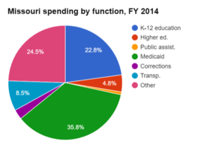 State spending in Missouri can be further broken down by function (elementary and secondary education, public assistance, etc.). Fiscal year 2014 information is included in the table below (information from neighboring states is provided for additional context). Figures are rendered as percentages, indicating the share of the total budget spent per category.[2]