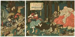 In Yamagata Prefecture among other areas, thickets in the mountains during summer, there are several tens of tsubo of moss and sand that were revered as the "nesting grounds of tengu," and in mountain villages in the Kanagawa Prefecture, they would cut trees at night and were called "tengu daoshi" (天狗倒し, tengu fall), and mysterious sounds at night of a tree being cut and falling, or mysterious swaying sounds despite no wind, were considered the work of mountain tengu. It is also theorized that shooting a gun three times would make this mysterious sound stop. Besides this, in the Tone District, Gunma Prefecture, there are legends about the "tengu warai" (天狗笑い, tengu laugh) about how one would hear laughter out of nowhere, and if one simply presses on further, it'd become an even louder laugh, and if one tries laughing back, it'd laugh even louder than before, and the "tengu tsubute" (天狗礫, tengu pebble) (said to be the path that tengu go on) about how when walking on mountain paths, there would be a sudden wind, the mountain would rumble, and stones would come flying, and places tengu live such as "tenguda" (天狗田, tengu field), "tengu no tsumetogi ishi" (天狗の爪とぎ石, tengu scratching stone), "tengu no yama" (天狗の山, tengu mountain), "tengudani" (天狗谷, tengu valley), etc., in other words, "tengu territory" (天狗の領地) or "tengu guest quarters" (狗賓の住処). In Kanazawa's business district Owari in Hōreki 5 (1755), it is said that a "tengu tsubute" (天狗つぶて) was seen. In Mt. Ogasa, Shizuoka Prefecture, a mysterious phenomenon of hearing the sound of hayashi from the mountains in the summer was called "tengubayashi" (天狗囃子), and it is said to be the work of the tengu at Ogasa Jinja.[26] On Sado Island (Sado, Niigata Prefecture), there were "yamakagura" (山神楽, mountain kagura), and the mysterious occurrence of hearing kagura from the mountains was said to be the work of a tengu.[27] In Tokuyama, Ibi District, Gifu Prefecture (now Ibigawa), there were "tengu taiko" (天狗太鼓), and the sound of taiko (drums) from the mountains was said to be a sign of impending rain.[28]