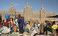 Regardless, Mali gradually converted to Islam, playing a major role in spreading the religion across western Africa. One of the empire's most important trade centers was Timbuktu, becoming home of the "great mosque", also known as Djinguereber or Jingereber, designed by the famous architect Ishak al-Tuedjin, who had been enticed to move to Mali from Cairo, Egypt.[9] Trade caused the city to explode in size, as warehouses needed to be built to store goods and inns had to be built to house weary merchants. Mansa Musa I famously went on a hajj to Mecca around 1324 CE, traveling with a huge entourage and throwing around so much gold that he crashed the markets across Egypt for twelve years.[10] Arab historian Al-Makrizi wrote about the king's visit to Cairo, describing Musa as "a young man with a brown skin, a pleasant face and good figure... His gifts amazed the eye with their beauty and splendour."[10] Musa then brought home many Arab architects, artists, and scholars.