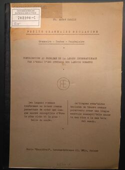 Neolatino[19][23][24] is a Romance zonal auxiliary language proposed to be used as a global international auxiliary language. It was developed by francophone Swiss linguist André Schild (1910–1981), who presented it in Petite Grammaire Neolatine,[25] published in January 1947. This first work includes grammar, vocabulary and sample texts. An international group of supporters was founded shortly after, which published in Neolatino a bulletin with texts from several authors (Buletino del Grupo Internacionale Neolatinista de Correspondentes) from May 1947 until, at least, February 1949 (18 numbers).[26] Later in 1947, Schild published an extended dictionary in Vocabulario Neolatino: Francese-Italiano-Hispano.[27] In 1948, a group improved and further developed the language: Comitato Linguístico Neolatino, with Schild as its president. R. L. Stevenson's tale Will o' the mill: The plain and the stars was translated into Neolatino by H. Littlewood as Gulielmo del molino: La planura e las stelas.