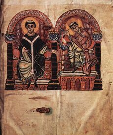 The conversion of the Suebi to Orthodoxy is presented very differently in the primary sources. A contemporary record, the minutes of the First Council of Braga—which met on 1 May 561—state explicitly that the synod was held at the orders of a king named Ariamir. While his Orthodoxy is not in doubt, that he was the first Orthodox monarch of the Suebes since Rechiar has been contested on the grounds that he is not explicitly stated to have been.[56] He was, however, the first to hold an Orthodox synod. On the other hand, the Historia Suevorum of Isidore of Seville states that it was Theodemar who brought about the conversion of his people from Arianism with the help of the missionary Martin of Braga.[57] And finally, according to the Frankish historian Gregory of Tours, an otherwise unknown sovereign named Chararic, having heard of Martin of Tours, promised to accept the beliefs of the saint if only his son was cured of leprosy. Through the relics and intercession of Saint Martin the son was healed; Chararic and the entire royal household converted to the Nicene faith.[58] As the coming of the relics of Saint Martin of Tours and the conversion of Chararic are made to coincide in the narration with the arrival of Martin of Braga, circa 550, this legend has been interpreted as an allegory of the pastoral work of Saint Martin of Braga, and of his devotion to Saint Martin of Tours.[59]