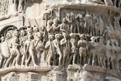 Little is known about the Suebi who crossed the Rhine on the night of 31 December 406 AD and entered the Roman Empire. It is speculated that these Suevi are the same group as the Quadi, who are mentioned in early writings as living north of the middle Danube, in what is now lower Austria and western Slovakia,[3][4] and who played an important part in the Germanic Wars of the 2nd century, when, allied with the Marcomanni, they fought fiercely against the Romans under Marcus Aurelius. The main reason behind the identification of the Suevi and Quadi as the same group comes from a letter written by St. Jerome to Ageruchia, listing the invaders of the 406 crossing into Gaul, in which the Quadi are listed and the Suevi are not.[4] The argument for this theory, however, is based solely on the disappearance of the Quadi in the text and the emergence of the Suevi, which conflicts with the testimony of other contemporary authors, such as Orosius, who did indeed cite the Suevi among the peoples traversing the Rhine in 406, and side by side with Quadi, Marcomanni, Vandals and Sarmatians in another passage.[5] Sixth century authors identified the Sueves of Gallaecia with the Alamanni,[6] or simply with Germans,[7] whilst the 4th century Laterculus Veronensis mentions some Suevi side by side with Alamanni, Quadi, Marcomanni and other Germanic peoples.