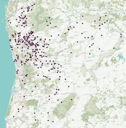 Most notable were their contributions to local toponymy and anthroponymy, as personal names borne by the Sueves were in use among Galicians up to the Low Middle Ages, while East Germanic names in general were most common among locals during the High Middle Ages.[121] From these names is derived also a rich toponymy, found mainly in northern Portugal and Galicia,[26] and made up of several thousand place names derived directly from Germanic personal names, expressed as Germanic or Latin genitives:[122] Sandiás, medieval Sindilanes, Germanic genitive form of the name Sindila; Mondariz from the Latin genitive form Munderici Munderic's; Gondomar from Gundemari and Baltar from Baltarii, both in Portugal and Galicia; Guitiriz to Witterici. Another group of toponyms which point to old Germanic settlements are the places named Sa, Saa, Sas, in Galicia, or Sá in Portugal, all derived from the Germanic word *sal- 'house, hall',[106] and distributed mostly around Braga, Porto and in the Minho river valley in Portugal, and around Lugo in Galicia, totalling a few hundred.
