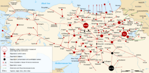 Map of massacre locations and deportation and extermination centers during the Armenian genocide