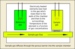 A typical thermal helium analyser comprises two chambers, each with an identical thermal conductivity sensor. One chamber is sealed and is filled with pure helium as the reference gas, and the other receives the sample gas. The difference in thermal conductivity of the reference and sample gases is measured and converted into a concentration value by the electronic circuitry in the instrument. The system is inherently stable and when precise temperature compensation is made, the system is more than adequately accurate for breathing gas analysis. Accuracy and display precision is typically within 0.1%, and accuracy within 1% is considered sufficient for most decompression algorithms.[1]