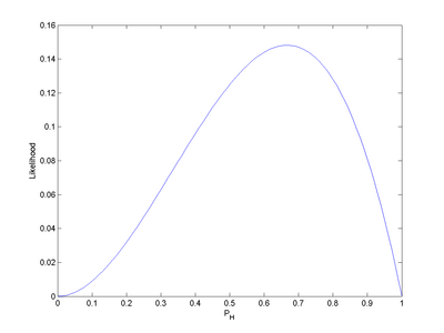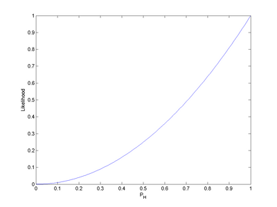 [math]\displaystyle{ \mathcal{L}(p_\text{H}=0.3 \mid \text{HH}) = 0.09. }[/math]