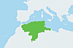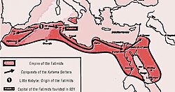 Between 902 and 909 AD the Fatimid state was founded by the Kutama Berbers from Little Kabylie, whose conquest of Ifriqiya resulted in the creation of the Caliphate.[19][20][21][22][4][5][23] After the conquest of Ifriqiya the Kutama Berbers conquered the realm of the Rustamids on the way to Sijilmasa which they also briefly conquered. There the imprisoned Abdullāh al-Mahdī Billa was freed, accepted as the Imam of the movement, and installed as the first Caliph and founder of the ruling dynasty.[24][25][26] The historian Heinz Halm describes the early Fatimid state as being "a hegemony of the Kutama and Sanhaja Berbers over the eastern and central Maghrib" and Prof. Dr. Loimeier states that rebellions against the Fatimids were also expressed through protest and opposition to Kutama rule.[27][28] The weakening of the Abbasids allowed Fatimid-Kutama power to quickly expand and in 959 Ziri ibn Manad, Jawhar the Sicilian and a Kutama army conquered Fez and Sijilmassa in Morocco.[29] [28] In 969 under the command of Jawhar, the Fatimid Kutama troops conquered Egypt from the Ikhsidids, the Kutama Berber general Ja'far ibn Fallah was instrumental in this success: he led the troops that crossed the river Nile and according to al-Maqrizi, captured the boats used to do this from a fleet sent by Ikhshidid loyalists from Lower Egypt.[30] The Kutama general Ja’far then invaded Palestine and conquered Ramla, the capital, he then conquered Damascus and made himself the master of the city and then he moved north and conquered Tripoli.[31][32] It was around this time period that the Fatimid Caliphate reached its territorial peak of 4,100,000 km2.[33]