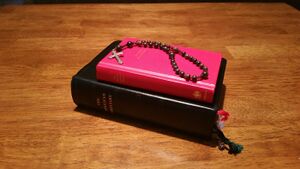 In the Bible, prayer cloths and holy oil are mentioned in reference to praying for healing.[2] Holy water is a sacramental that believers use to recall their baptism; other common sacramentals include blessed candles (often given to churchgoers on Candlemas), blessed palms (given away at churches on Palm Sunday), blessed ashes (placed on believers' foreheads on Ash Wednesday services), a cross necklace (often taken to be blessed by a pastor before daily use), a headcovering (worn by women, especially during prayer and worship), blessed salt, and holy cards, as well as Christian art, especially a crucifix.[3][4] Apart from those worn daily, such as a cross necklace or devotional scapular, sacramentals such as a Family Bible, are often kept on home altars in Christian households.[5][6] When blessed in a betrothal ceremony, engagement rings become a sacramental.[7]