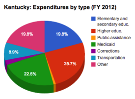 State expenditures in Kentucky can be further broken down by function (elementary and secondary education, public assistance, etc.). Fiscal year 2012 data is included in the table below (information from neighboring states is provided for additional context). Figures are rendered as percentages, indicating the share of the total budget spent per category.