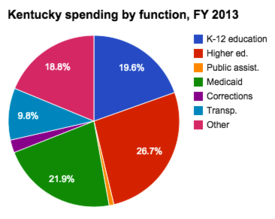 State spending in Kentucky can be further broken down by function (elementary and secondary education, public assistance, etc.). Fiscal year 2014 information is included in the table below (information from neighboring states is provided for additional context). Figures are rendered as percentages, indicating the share of the total budget spent per category.[2]