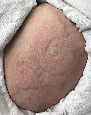Hives, also known as wheals and urticaria, is a kind of skin rash with red, raised, itchy bumps.[1][2] They may also burn or sting.[3] Often the patches of rash move around.[3] Typically they last a few days and do not leave any long-lasting skin changes.[3] Fewer than 5% of cases last for more than six weeks.[3] The condition frequently recurs.[3]
