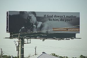 In spring 2009, AiG managed to get itself into a small(ish) controversy by shifting its publicity focus from creationism to the denigration of atheism in general. This resulted in a billboard and TV advertising campaign featuring a young boy pointing a gun straight at the viewer, stating "If God doesn't matter to him, do you?", thus implying that atheists, agnostics, or basically any non-Christian would be prone to murder.[24] AiG claim that this was to highlight school shootings and their so-called links with Darwinism, but it's quite clear that they were just pissed off after atheists decided to get their own billboard.