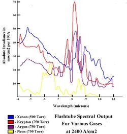 Calculations for luminous efficiency become more complex for lamps that produce white light or a mixture of spectral lines. Fluorescent lamps have higher wall-plug efficiencies than low-pressure sodium lamps, but only have half the luminous efficacy of ~ 100 lm/w, thus the luminous efficiency of fluorescents is lower than sodium lamps. A xenon flashtube has a typical wall-plug efficiency of 50–70%, exceeding that of most other forms of lighting. Because the flashtube emits large amounts of infrared and ultraviolet radiation, only a portion of the output energy is used by the eye. The luminous efficacy is therefore typically around 50 lm/w. However, not all applications for lighting involve the human eye nor are restricted to visible wavelengths. For laser pumping, the efficacy is not related to the human eye so it is not called "luminous" efficacy, but rather simply "efficacy" as it relates to the absorption lines of the laser medium. Krypton flashtubes are often chosen for pumping Nds, even though their wall-plug efficiency is typically only ~ 40%. Krypton's spectral lines better match the absorption lines of the neodymium-doped crystal, thus the efficacy of krypton for this purpose is much higher than xenon; able to produce up to twice the laser output for the same electrical input.[8][9] All of these terms refer to the amount of energy and lumens as they exit the light source, disregarding any losses that might occur within the lighting fixture or subsequent output optics. Luminaire efficiency refers to the total lumen-output from the fixture per the lamp output.[10]