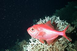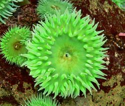 Coral reefs are some of the most biodiverse habitats on earth, supporting large numbers of species of corals, fish, molluscs, worms, arthropods, starfish, sea urchins, other invertebrates and algae. Because of the photosynthetic requirements of the corals, they are found in shallow waters, and many of these fringe land masses.[24] With a three-dimensional structure, coral reefs are very productive ecosystems; they provide food for their inhabitants, hiding places of various sizes to suit many organisms, perching places, barriers to large predators and solid structures on which to grow. They are used as breeding grounds and as nurseries by many species of pelagic fish, and they influence the productivity of the ocean for miles around.[25] Anthozoans prey on animals smaller than they are and are themselves eaten by such animals as fish, crabs, barnacles, snails and starfish. Their habitats are easily disturbed by outside factors which unbalance the ecosystem. In 1989, the invasive crown-of-thorns starfish (Acanthaster planci) caused havoc in American Samoa, killing 90% of the corals in the reefs.[26]