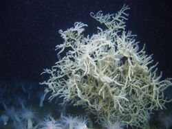 Plumapathes pennacea | Bushy colonies with slender branches. Axial skeleton of dark-coloured thorny branches strengthened by a unique, non-collagen protein. Azooxanthellate.[2] | On vertical rock faces of reefs, or in deep water.[2] |