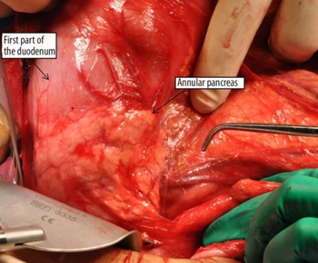 Annular pancreas is a rare condition in which the second part of the duodenum is surrounded by a ring of pancreatic tissue continuous with the head of the pancreas. This portion of the pancreas can constrict the duodenum and block or impair the flow of food to the rest of the intestines. It is estimated to occur in 1 out of 12,000 to 15,000 newborns.[1] The ambiguity arises from the fact that not all cases are symptomatic.[2]
