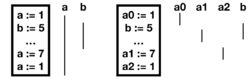 Linear scan is another global register allocation approach. It was first proposed by Poletto et al. in 1999.[26] In this approach, the code is not turned into a graph. Instead, all the variables are linearly scanned to determine their live range, represented as an interval. Once the live ranges of all variables have been figured out, the intervals are traversed chronologically. Although this traversal could help identifying variables whose live ranges interfere, no interference graph is being built and the variables are allocated in a greedy way.[24]