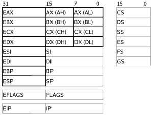 In some architectures, assigning a value to one register can affect the value of another: this is called aliasing. For example, the x86 architecture has four general purpose 32-bit registers that can also be used as 16-bit or 8-bit registers.[11] In this case, assigning a 32-bit value to the eax register will affect the value of the al register.