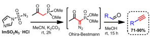 Recently a safer and more scalable approach has been developed for the synthesis of alkynes from aldehydes. This protocol takes advantage of a stable sulfonyl azide, rather than tosyl azide, for the in situ generation of the Ohira−Bestmann reagent.[6]