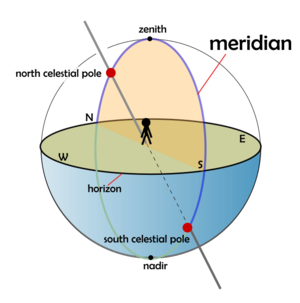 There are several ways to divide the meridian into semicircles. In the horizontal coordinate system, the observer's meridian is divided into halves terminated by the horizon's north and south points. The observer's upper meridian, extends from a celestial pole, and passes through the zenith to contact the opposite pole while the lower meridian passes through the nadir to contact both poles at the opposite ends. Another way, the meridian is divided into the local meridian, the semicircle that contains the observer's zenith and the north and south points of their horizon,[1][2] and the opposite semicircle, which contains the nadir and the north and south points of their horizon.
