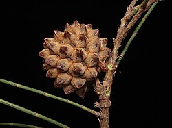 Casuarina cristata is a dioecious tree that typically grows to a height of 10–20 m (33–66 ft), has a DBH of up to 1 m (3 ft 3 in), and often produces suckers. Its bark is finely fissured or scaly and dark greyish brown. The branchlets are often drooping, up to 250 mm (9.8 in) long, the leaves reduced to scale-like teeth 0.5–0.7 mm (0.020–0.028 in) long, arranged in whorls of 8 to 12 around the branchlets. The sections of branchlet between the leaf whorls (the "articles") are 8–17 mm (0.31–0.67 in) long and 0.6–0.9 mm (0.024–0.035 in) wide. The flowers on male trees are arranged in spikes 13–50 mm (0.51–1.97 in) long, the anthers 0.8–1.1 mm (0.031–0.043 in) long. The female cones are covered with rusty hairs when young, later glabrous, on a peduncle 1–14 mm (0.039–0.551 in) long. The mature cones are usually 13–18 mm (0.51–0.71 in) long and 10–16 mm (0.39–0.63 in) in diameter, the samaras 6.0–10.5 mm (0.24–0.41 in) long.[2][3][4][5]