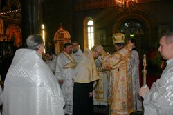 After being tonsured, the reader is vested in a short phelon,[12] which he wears while reading the Epistle for the first time. This short phelon is then removed (and never worn thereafter) and replaced with a stikhar, which the reader wears thereafter whenever he performs his liturgical duties. This practice is not universal, however, and many bishops and priests will allow a reader to perform his function dressed only in a cassock or (if a monk) a riassa.[13] Sometimes, a bishop will decree what vesting practice he wishes to be followed within his own diocese.[14]