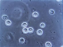 | Multiple white cells seen in the urine of a person with a urinary tract infection using microscopy | |
