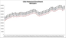 The CSU confers over 110,000 degrees each year, awarding almost half of the state's bachelor's degrees and one-fourth of the state's master's degrees.[124] The entire 23 campus system sustains over 209,000 jobs statewide,[124] generating $1.6 billion in tax revenue. Total CSU related expenditures equate to $26.9 billion.[124]