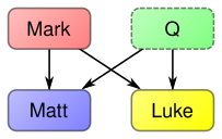 Many lines of evidence point to Mark having some sort of special place in the relationship among the Synoptics, as the "middle term" between Matthew and Luke.[25] But this could mean that Mark is the common source of the other two (priority), or that it derives from both (posteriority), or even that it is an intermediary in transmission from one to the other—in other words, many such arguments can support both Marcan priority and its rivals.[26] Famously, the so-called "Lachmann fallacy", concerning the order of pericopae in Mark, was once used to argue for Marcan priority but is now seen as a largely neutral observation.[26]