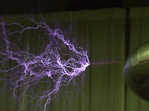 The dielectric breakdown strength of dry air, at Standard Temperature and Pressure (STP), between spherical electrodes is approximately 33 kV/cm.[8] This is only as a rough guide, since the actual breakdown voltage is highly dependent upon the electrode shape and size. Strong electric fields (from high voltages applied to small or pointed conductors) often produce violet-colored corona discharges in air, as well as visible sparks. Voltages below about 500–700 volts cannot produce easily visible sparks or glows in air at atmospheric pressure, so by this rule these voltages are "low". However, under conditions of low atmospheric pressure (such as in high-altitude aircraft), or in an environment of noble gas such as argon or neon, sparks appear at much lower voltages. 500 to 700 volts is not a fixed minimum for producing spark breakdown, but it is a rule-of-thumb. For air at STP, the minimum sparkover voltage is around 327 volts, as noted by Friedrich Paschen.[9]