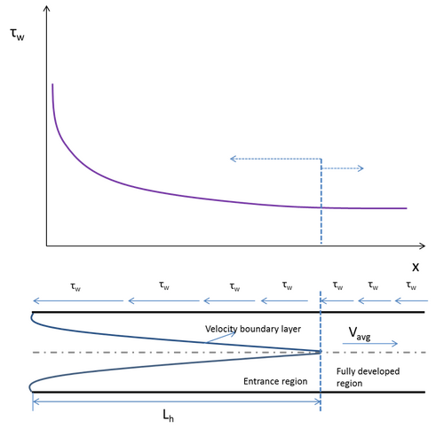 In the hydrodynamic entrance region, the wall shear stress, , is highest at the pipe inlet, where the boundary layer thickness is the smallest. Shear stress decreases along the flow direction.[6] That is why the pressure drop is highest in the entrance region of a pipe, which increases the average friction factor for the whole pipe. This increase in the friction factor is negligible for long pipes.[6] In a fully developed region, the pressure gradient and the shear stress in flow are in balance.[6]