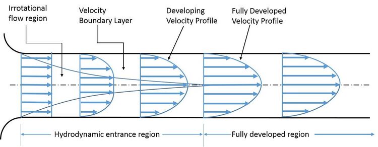 The hydrodynamic entrance region refers to the area of a pipe where fluid entering a pipe develops a velocity profile due to viscous forces propagating from the interior wall of a pipe.[1] This region is characterized by a non-uniform flow.[1] The fluid enters a pipe at a uniform velocity, then fluid particles in the layer in contact with the surface of the pipe come to a complete stop due to the no-slip condition. Due to viscous forces within the fluid, the layer in contact with the pipe surface resists the motion of adjacent layers and slows adjacent layers of fluid down gradually, forming a velocity profile.[4] For the conservation of mass to hold true, the velocity of layers of the fluid in the center of the pipe increases to compensate for the reduced velocities of the layers of fluid near the pipe surface. This develops a velocity gradient across the cross-section of the pipe.[5]