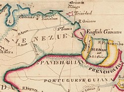 English and Dutch settlers were regularly harassed by the Spanish and Portuguese, who viewed settlement of the area as a violation of the Treaty of Tordesillas. In 1613, Dutch trading posts on the Essequibo and Corantijn Rivers were completely destroyed by Spanish troops. The troops had been sent into the Guianas from neighbouring Venezuela under the premise of stamping out privateering and with the support of a cédula passed by the Spanish Council of the Indies and King Philip III.[9] Nonetheless, the Dutch returned in 1615, founding a new settlement at present-day Cayenne (later abandoned in favour of Suriname), one on the Wiapoco River (now more commonly known as the Oyapock) and one on the upper Amazon. By 1621, a charter was granted by the Dutch States-General, but even a few years prior to the official chartering a fort and trading post had been built at Kijkoveral, under the supervision of Aert Groenewegen, at the confluence of the Essequibo, Cuyuni, and Mazaruni Rivers.[10] British settlers also succeeded in establishing a small settlement in 1606 and a much larger one in modern-day Suriname in 1650, under the leadership of former Barbadian governor Francis Willoughby, Lord Parham.[9]: 76