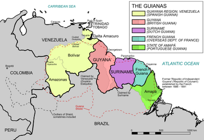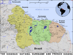 The Guianas,[lower-alpha 1] also spelled Guyanas or Guayanas, are a geographical region in north-eastern South America. In contemporary use, the term usually refers to "the three Guianas": Guyana, Suriname, and French Guiana. More broadly, it refers to the South American coast from the mouth of the Orinoco to the mouth of the Amazon.