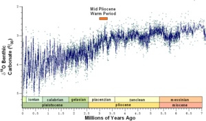 Carbon dioxide concentration during the mid Pliocene has been estimated at around 400 ppmv from 13C/12C ratio in organic marine matter[13] and stomatal density of fossilized leaves,[14] decreasing carbon dioxide levels during late Pliocene may have contributed substantially to global cooling and the onset of northern hemisphere glaciation.[11]