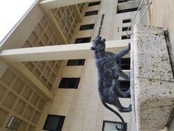 The building had two 1971 murals by Harvey Johnson,[28] a longtime TSU art instructor, about African influences in U.S. culture and mothers: Mothers of "the Fathers and the Son" and Dere's a "Han Writin on de Wall". He was educated by the founder of the TSU art school, Dr. John T. Biggers.[29] It, as part of the Black Power movement, was Johnson's senior project, as the university at the time allowed its students to create murals on campus property. African American Vernacular English (AAVE) was a feature of the titles.[28]