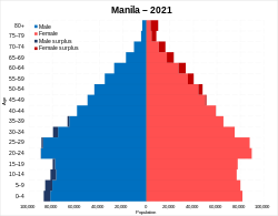 Manila has been presumed to be the Philippines' largest city since the establishment of a permanent Spanish settlement, and eventually became the political, commercial, and ecclesiastical capital of the country.[211] Since colonial times, Manila has been the destination of peoples whose origins are as wide-ranging as India[212] and Latin America.[213] Practicing forensic anthropology, while exhuming cranial bones in several Philippine cemeteries, researcher Matthew C. Go estimated that 7% of the mean amount, among the samples exhumed, have attribution to European descent.[214] Research work published in the Journal of Forensic Anthropology, collating contemporary Anthropological data show that the percentage of Filipino bodies who were sampled from the University of the Philippines, that is phenotypically classified as Asian (East, South and Southeast Asian) is 72.7%, Hispanic (Spanish-Amerindian Mestizo, Latin American, and/or Spanish-Malay Mestizo) is at 12.7%, Indigenous American (Native American) at 7.3%, African at 4.5%, and European at 2.7%.[215] Between the 1860s and 1890s, in urban areas of the Philippines – especially Manila – according to burial statistics, as much as 3.3% of the population were pure European Spaniards and pure Chinese composed 9.9% of the city's populace. The Spanish-Filipino and Chinese-Filipino Mestizo populations also fluctuated. Eventually, these non-native categories diminished because they were assimilated into the majority Austronesian Filipino population.[216] During the Philippine Revolution, the term "Filipino" included people of any race born in the Philippines.[217][218] This explains the abrupt drop of the proportion of Chinese, Spanish, and Mestizo peoples across the country by the time of the first American census in 1903.[219] Manila's population dramatically increased since the 1903 census because people tended to move from rural areas to towns and cities. In the 1960 census, Manila became the first Philippine city to exceed one million people – more than five times of its 1903 population. The city continued to grow until the population stabilized at 1.6 million and experienced alternating increases and decreases starting in the 1990 census year. This phenomenon may be attributed to the higher growth experienced by suburbs and the already-very-high population density of the city. As such, Manila exhibited a decreasing percentage share of the metropolitan population[220] from 63% in the 1950s to 27.5%[221] in 1980, and 13.8% in 2015. The much-larger Quezon City marginally surpassed the population of Manila in 1990 and by the 2015 census it already has 1.1 million more people. Nationally, the population of Manila was expected to be overtaken by cities with larger territories such as Caloocan and Davao City by 2020.[222] The vernacular language is Filipino, which is mostly based on the Tagalog language of the city and its surroundings, and this Manilan form of spoken Tagalog has become the lingua franca of the Philippines, having spread throughout the archipelago through mass media and entertainment. English is the language most widely used in education and business, and is in heavy everyday use throughout Metro Manila and the rest of the Philippines.
