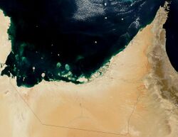 The UAE coast stretches for nearly 650 km (404 mi) along the southern shore of the Persian Gulf, briefly interrupted by an isolated outcrop of the Sultanate of Oman. Six of the emirates are situated along the Persian Gulf, and the seventh, Fujairah is on the eastern coast of the peninsula with direct access to the Gulf of Oman.[97] Most of the coast consists of salt pans that extend 8–10 km inland.[98] The largest natural harbor is at Dubai, although other ports have been dredged at Abu Dhabi, Sharjah, and elsewhere.[99] Numerous islands are found in the Persian Gulf, and the ownership of some of them has been the subject of international disputes with both Iran and Qatar. The smaller islands, as well as many coral reefs and shifting sandbars, are a menace to navigation. Strong tides and occasional windstorms further complicate ship movements near the shore. The UAE also has a stretch of the Al Bāţinah coast of the Gulf of Oman. The Musandam Peninsula, the very tip of Arabia by the Strait of Hormuz, and Madha are exclaves of Oman separated by the UAE.[100]