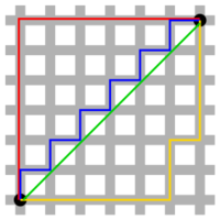 | 1-norm distance | [math]\displaystyle{ = \sum_{i=1}^n \left| x_i - y_i \right| }[/math] |