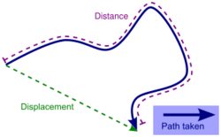 The distance covered by a vehicle (for example as recorded by an odometer), person, animal, or object along a curved path from a point A to a point B should be distinguished from the straight-line distance from A to B. For example, whatever the distance covered during a round trip from A to B and back to A, the displacement is zero as start and end points coincide. In general the straight-line distance does not equal distance travelled, except for journeys in a straight line.