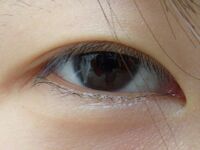 With few exceptions, all mammals have brown or darkly-pigmented irises.[24] In humans, brown eyes result from a relatively high concentration of melanin in the stroma of the iris, which causes light of both shorter and longer wavelengths to be absorbed[25][26] and in many parts of the world, it is nearly the only iris color present.[27] Dark pigment of brown eyes is most common in East Asia, Southeast Asia, South Asia, West Asia, Oceania, Africa, Americas, etc. as well as parts of Eastern Europe and Southern Europe.[28] The majority of people in the world overall have dark brown eyes. Brown irises range from highly pigmented, dark brown (almost black) eyes, to very light, almost amber or hazel irises composed partially of lipochrome. of Light or medium-pigmented brown eyes are common in Europe, Afghanistan, Pakistan and Northern India, as well as some parts of the Middle East, and can also be found in populations in East Asia and Southeast Asia, but are proportionally rare. (See eye color).